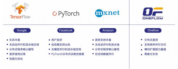 OneFlow 历经两年的研发,2018 年 10 月份才推出 1.0 版本,还是一个很年轻的系统,目前正在客户的生产环境里面试用和迭代。实事求是的讲,我们在模型的丰富程度,易用性,多语言支持等方面还有比较大的提升空间,目前是落后于其它框架的。但是,OneFlow 在企业级大规模应用上是称得上遥遥领先的:(1)分布式最容易使用,用户在写程序的时候是感受不到多机和单机的区别的;(2)OneFlow 支持数据并行,模型并行和流水并行,而其它框架只支持最容易支持的数据并行;(3)OneFlow 在分布式训练时的扩展能力,加速比是最优秀的。这些特点也正是 OneFlow 作为企业级深度学习框架,比已有开源深度学习框架优秀之处。