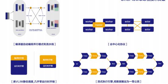 为了对任意作业和资源都达到类似巨大单体专用芯片的效果,OneFlow 首创了静态调度(左图)和流式执行(右图)架构的深度学习框架。静态调度是什么思路呢?它来自于计算机体系结构。我们熟知的 CPU 芯片中真正做算术运算的器件只占很小比例的面积,大部分面积在做乱序执行,流水线和缓冲区的管理。学界和工业界很久以前就开始探索怎么让芯片的有效面积尽可能多的做算术运算,静态调度的思路应运而生,基本上是把流水管理,指令排布之类的工作从硬件转移至编译器。这样硬件复杂度就可以大幅降低,当然编译器复杂度肯定会提高很多。有一个叫 VLIW(超长指令集架构)的指令集就采用了这种思路。OneFlow 的静态调度体现在两方面,首先,编译器自动解决从逻辑任务到硬件资源的映射,包括数据并行,模型并行,流水并行的设备分配以及数据路由方案,大大降低了分布式编程的复杂度,用户只需要关心任务的逻辑结构以及本次任务可使用的硬件资源,而不用去编程实现数据在硬件资源中的流动机制;其次,静态调度把所有能在正式运行之前得到的调度策略,资源管理策略等问题都在编译阶段解决,运行时就不需要在线求解最优的调度方案,从而大大降低运行时开销。