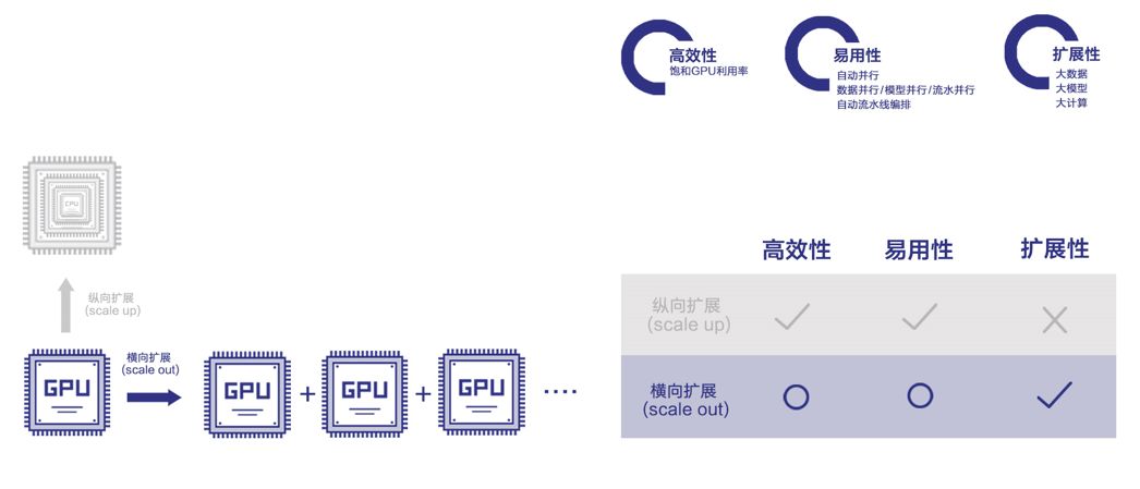 业界有人工智能浪潮的三驾马车之说,即数据、算法、算力。具体到算力,业界更多关注的是硬件,譬如 GPU,甚至是 TPU 之类的 AI 专用芯片。但是,人们发现,有了更快的加速器之后,制约大规模分布式训练算力的瓶颈是软件。怎么帮助数据科学家和研究员们更轻松的把各种算法在底层硬件上跑起来,而且充分释放底层硬件的潜力,正是软件框架需要解决的问题。目前,已有的开源深度学习框架对数据并行场景解决的比较好,但遇到模型越来越大的场景就没有好办法。用户或者束手无策,或者只能付出极大成本基于开源框架做深度定制开发来满足需求。OneFlow 团队的目标是研发一个通用框架自动解决这些问题,让那些没有框架研发能力的团队也能够享受分布式 GPU 集群带来的效率,这是我们历时两年多研发一套全新深度学习框架的初衷。