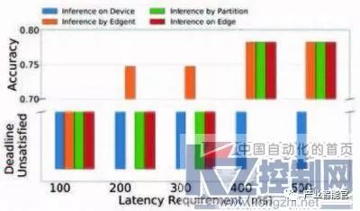 图6记录了深度学习模型不同的推理方式在不同的时延需求下的性能比较。在非常低的时延需求(100ms)下,这四种方法都不能满足需求。随着时延需求的上升,在200ms到300ms之间,本文框架的深度学习模型推理要比其他方法更早地实现工作。