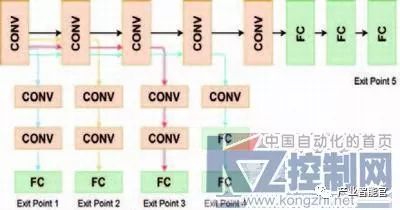 (1)分析边缘服务器与终端设备性能,针对不同类型的深度学习模型网络层,如卷积层,池化层等,生成基于回归模型的时延估算模型。在估算网络层的运行时延时,Edgent会对每层网络层进行建模而不是对整个深度学习模型进行建模,不同网络层的时延是由各自的自变量(如输入数据的大小、输出数据的大小)决定,基于每层的自变量,我们可以建立回归模型估算每层网络层的时延;(2)训练带有多个退出点的分支网络模型,从而实现模型精简,这里我们采用BranchyNet分支网络结构,在BranchyNet结构下,我们可以设计并训练出带有多个退出点的分支网络。图4展示了具有5个退出点的AlexNet模型,目前多退出点的深度神经网络模型由开源框架BranchyNet [14]支持。需要注意的是,性能分析取决于设备,而深度学习模型是取决于应用的,因此在给定设备的情况下即限定边缘服务器与终端设备,以上两个初始化操作在离线阶段只需要完成一次。