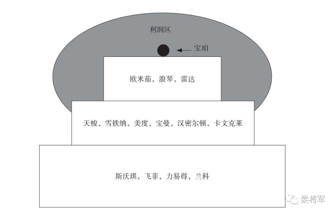 以上所有产品,都来自SMH的集团。按照价格从低到高来看,它的利润结构是金字塔型的。位于塔基的产品,价格低,但销量很高;位于塔顶的产品,价格很高,但销量很少。