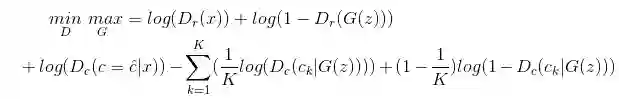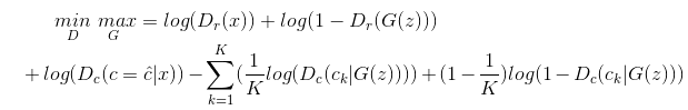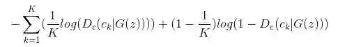 看上去有些复杂,实际上就是多标签交叉熵损失(Multi Label Cross Entropy Loss)。注意,这里的 K 表示分类的数目。这个损失跟常见分类器用的损失是一样的。生成器会将这部分值最小化,从而将新损失函数的值最大化。