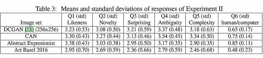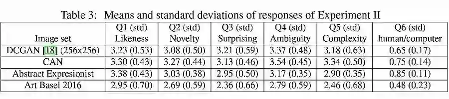 为了验证 CAN 生成的图像是否“有创意”,论文作者特意做了几组实验。他们请 Amazon MTurk 上的人类参与者观看 GAN、DC-GAN、CAN 生成的图像和人类画家的作品,然后评估图像的创新程度、复杂程度、让人意外的程度,以及是人类画家创作的,还是计算机生成的等问题。
