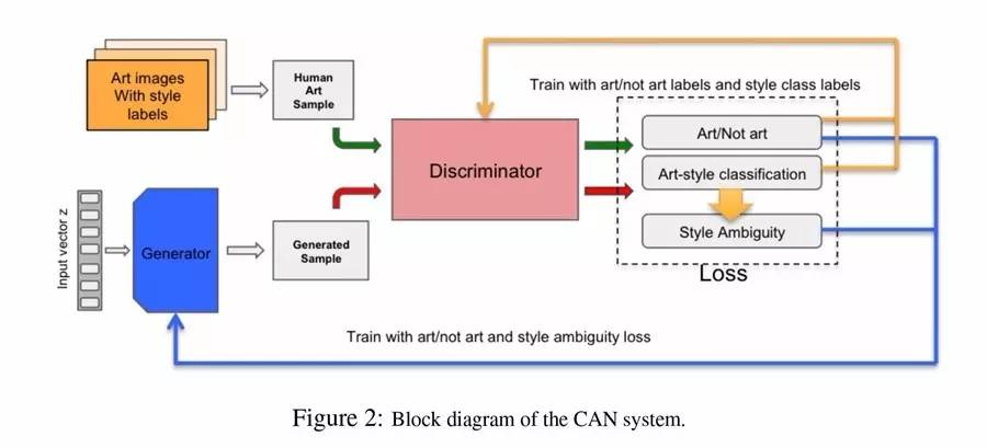 上图展示了创意对抗网络 CAN 的架构。可以发现,主要的修改发生在损失函数部分。新的损失函数如下: