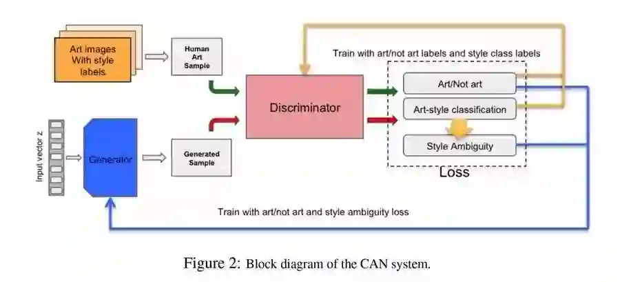 我们提出了一个新的艺术创作系统。这个系统能够通过观看图像学习风格进行艺术创作。不仅如此,这个系统还能偏离已经学会的风格,增强生成图像的唤醒能力(arousal potential),从而变得具有创造力。我们建立了生成对抗网络(GAN),GAN 在接收给定分布的输入后,能够学习生成全新的图像。我们认为,GAN 结构原本生成有创意的产品的能力有限。我们通过修改网络的目标,使其最大限度地偏离已经确立的风格,同时最小限度地偏离艺术分布,从而创造有创意的图像。我们进行了实验,比较了人类参与者观看系统生成的图像和艺术家创作的画作的反应。结果表明,人类参与者无法分辨系统生成的图像和当代艺术家在顶级艺术博览会中展示的画作。