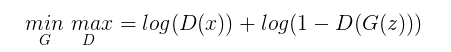 下标 G 和 D 分别代表生成器 G(Generator)和鉴别器 D(Discriminator)。生成器的工作是将方程的值最小化,而鉴别器负责将这个值最大化。生成器 G 和鉴别器 D 会一直博弈,直到我们决定停止为止。