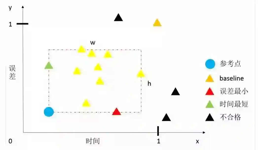 时间和误差会根据基准成绩归一化到 0-1 之间。在有效成绩中,会找出最小误差和最短时间的两个成绩(绿色三角形和红色三角形),最小误差和最短时间会组成一个参考点(蓝色圆圈)。最终所有的有效成绩都会和参考点计算距离,距离最短的方法视为优胜。从评测方法分析,时间和精度都是很重要的因素。而时间和精度往往是矛盾的,所以必须进行一定的取舍。