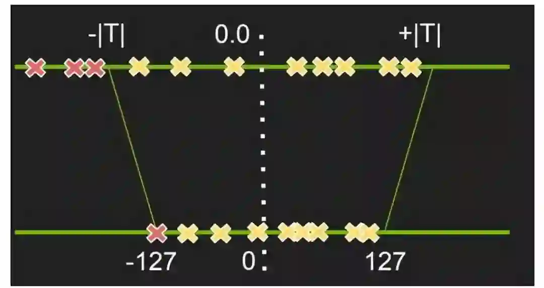 假设每个张量的数据符合均匀分布,那么其中的每一个元素就可以表示为一个 int8 数和一个 float32 的比例因子相乘的结果。比例因子是对于整个数组共享的。这样在张量间进行相乘运算时就可以先进行 int8 的计算,最后再统一乘上比例因子,从而加快运算。那么接下来的问题在于如何确定比例因子,比例因子的作用是将原始张量的数值范围映射到-127 到 127(int8 的数值范围)。由于大多数情况数据并不是完全的均匀分布,所以直接映射会造成精度损失。
