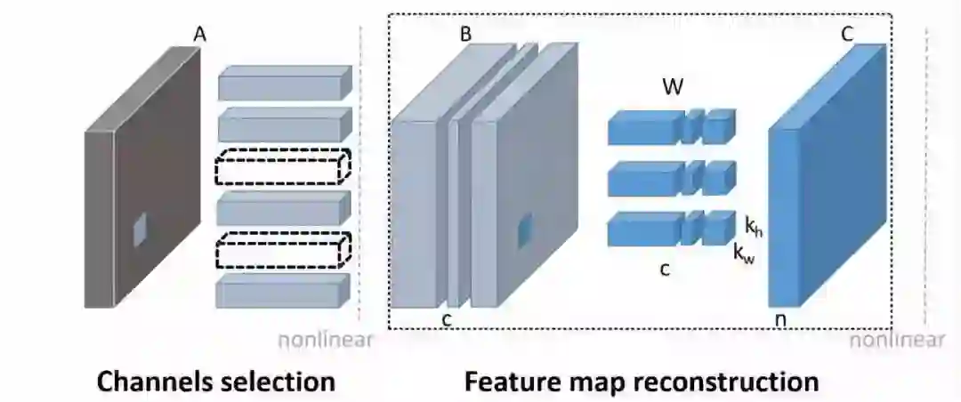 剪枝过程分为两步:首先,我们会基于 LASSO 回归来找到每一层中最具代表性的通道,然后将没用的通道去掉,再使用平方差损失微调剪枝后的网络来最小化重构误差。这样的操作会对每一层分别进行,经过几轮迭代后便可以达到不错的压缩效果,同时还可以保证精度不会损失太多。