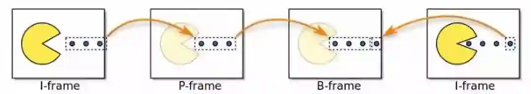主流的视频编码方式中,每个视频主要包含三种图片帧,分别叫做:Intra-coded frame(I 帧),Predictive frame(P 帧)和 Bi-Predictive frame(B 帧)。其中 I 帧是一张完整的图片。P 帧记录了与之前的帧的差别,所以在解码 P 帧时必须要参考之前的图片帧。而 B 帧不仅需要参考之前的图片帧,还需要参考之后的图片帧才能完整解码。图片 4 阐明了这三个概念 [2]。
