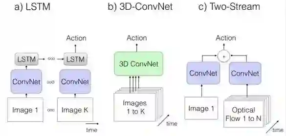 目前主流的视频分类的方法有三大类:基于 LSTM 的方法,基于 3D 卷积的方法和基于双流的方法。图片 5 展示了这三种框架的大体结构 [3]。