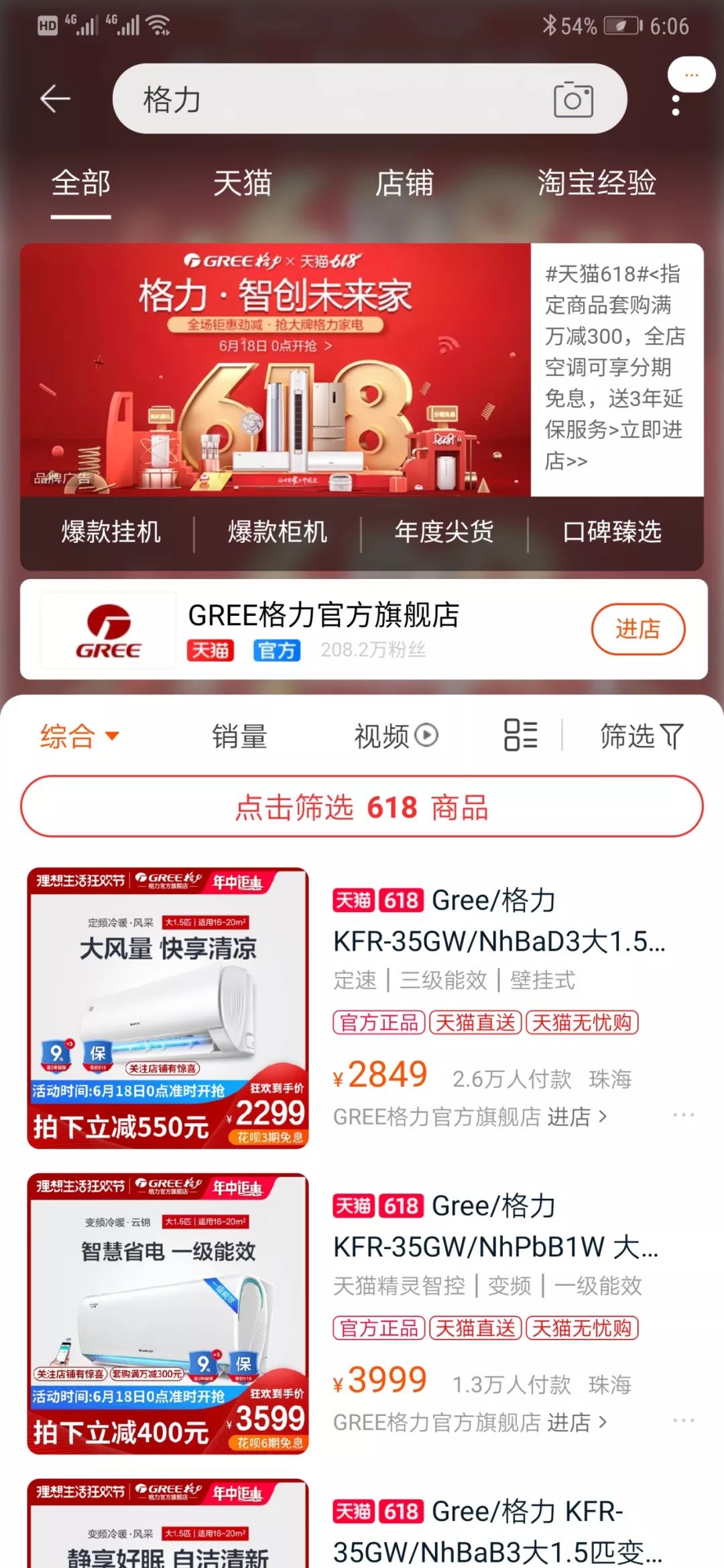 如果用同样的方法去搜索“海尔”“美的”“格力”,页面首要位置就是官方旗舰店,推荐的前几款商品也来源于官方旗舰店。