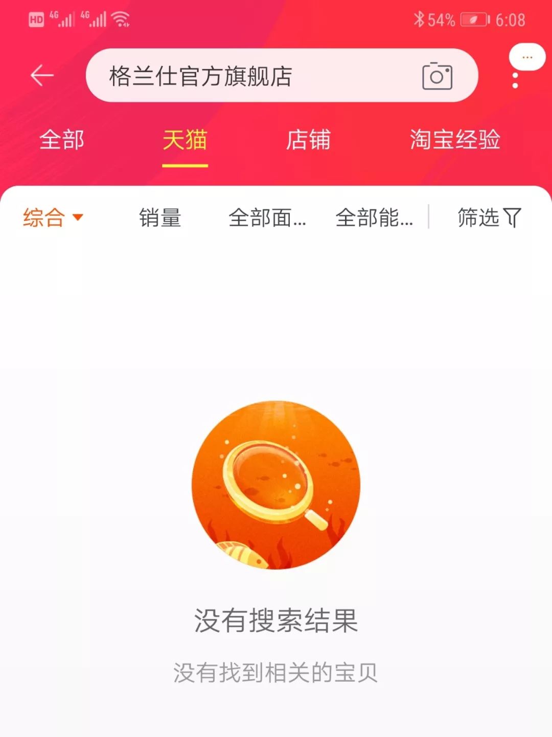 四、6月6日,在天猫平台搜索“格兰仕官方旗舰店”,无搜索结果,但实际上店铺依然存在,搜索店铺被屏蔽。