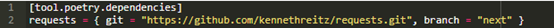 由于我们没有指定任何其他信息,所以Poetry假设我们打算使用主分支上的最新提交来构建我们的项目。您可以将git键与rev、tag或branch键组合在一起,用来指定其他东西。这里有个例子,说明您想要使用一个名为next的分支上最新的提交: