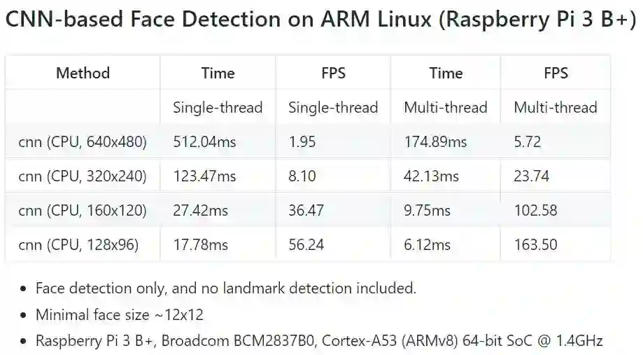 在ARM Linux (Raspberry Pi 3 B+)上进行人脸检测实验结果
