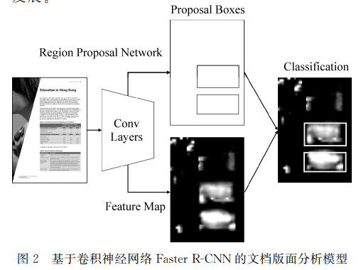 近年来,卷积神经网络在计算机视觉领域取得了 巨大的成功,特别是基于大规模标注数据集ImageNet 和 COCO 的有监督预训练模型 ResNet [2]在图像分 类、物体检测以及场景分割任务上都带来了极大的 性能提升。具体来讲,随着多阶段检测模型 Faster R-CNN [3]和 MaskR-CNN [4]等以及单阶段检测模 型SSD [5]和 YOLO [6]的普及,目标检测在计算机视 觉中几乎成了已解决问题。文档版面分析本质上可 以看作一种文档图像的物体检测任务,文档中的标 题、段落、表格、插图等基本单元就是需要检测和识 别的物体。