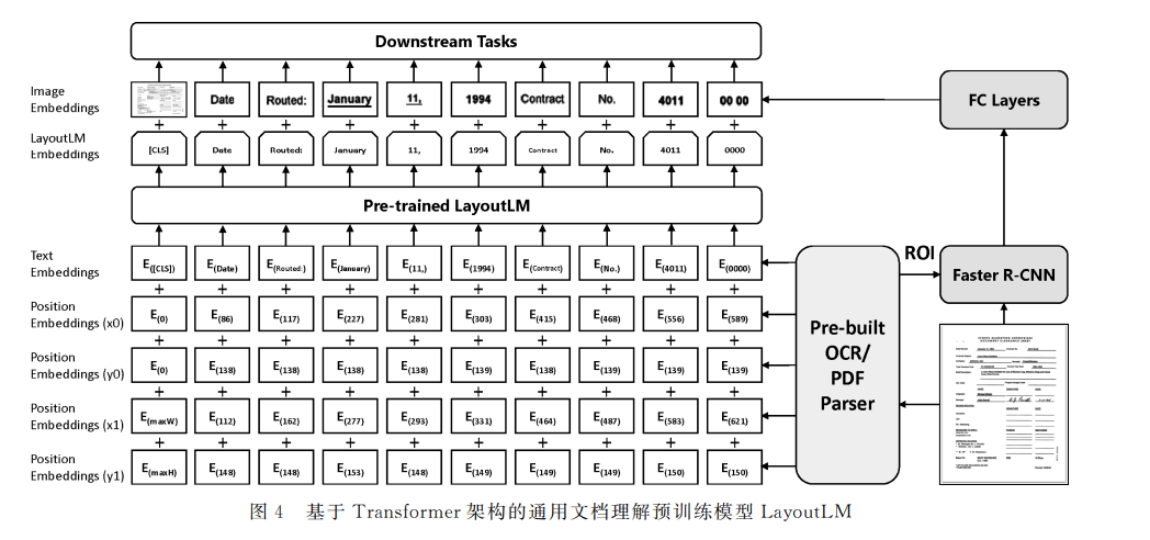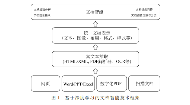 在过去的30年中, 文档智能的发展大致经历了三个阶段, 从简单的规则启发式方法逐渐进化至神经网络的方法。20世纪90年代初期,研究人员大多使用基于启发式规则的方法进行文档的理解与分 析,通过人工观察文档的布局信息,总结归纳一些处 理规则,对固定布局信息的文档进行处理。然而,传 统基于规则的方法往往需要较大的人力成本,而且 这些人工总结的规则可扩展性不强,因此研究人员 开始采用基于统计学习的方法。2000年以来,随着 机器学习技术的发展和进步,基于大规模标注数据 驱动的机器学习模型成了文档智能的主流方法,它 通过人工设计的特征模板,利用有监督学习的方式 在标注数据中学习不同特征的权重,以此来理解、分 析文档的内容和布局。然而,虽然传统的文档理解 和分析技术基于人工定制的规则或少量标注数据进 行学习,这些方法虽然能够带来一定程度的性能提 升,但由于定制规则和可学习的样本数量不足,其通 用性往往不尽如人意,而且针对不同类别文档的分 析迁移成本较高,这距离文档智能技术的实用化和 产业化还有相当一段距离。近年来,随着深度学习 技术的发展,以及大量无标注电子文档的积累,文档 分析与识别技术进入了一个全新的时代。图1是在 当前深度学习框架下文档智能技术的基本框架,其 中不同 类 型 的 文 档 通 过 内 容 提 取 工 具 (HTML/ XML抽取、PDF解析器、光学字符识别 OCR 等)将 文本内容、位置布局信息和视觉图像信息组织起来, 利用大规模预训练的深度神经网络进行分析,最终 完成各项下游应用任务,包括文档版面分析、文档信 息抽取、文档视觉问答以及文档图像分类等。深度 学习技术的出现,特别是以卷积神经网络(CNN)、 图神经网络(GNN)以及 Transformer架构[1]为代 表预训练技术的出现,彻底改变了传统机器学习需 要大量人工标注数据的前提,更多地依赖大量无标 注数据进行自监督学习,进而通过“预训练-微调”模 式来解决文档智能相关的应用任务,取得了显著性 突破。