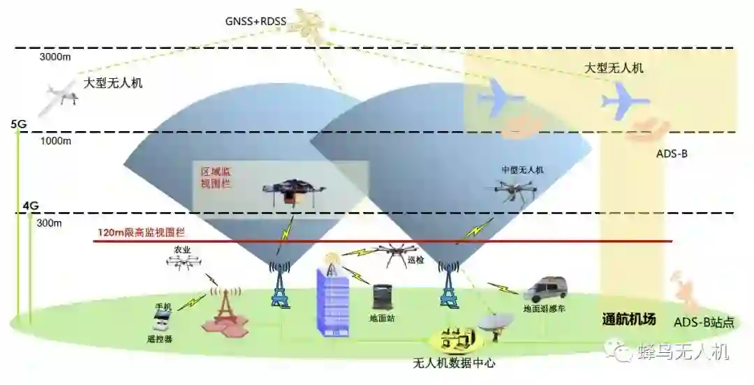 空地融合蜂窝通信:300 米以下(4G),1000 米以下(5G),全覆盖;