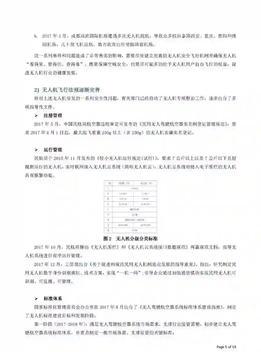 2017 年 12 月,工信部出台《关于促进和规范民用无人机制造业发展的指导意见》指出:研究制定民用无人机数字身份识别规则、技术方案,实现“一机一码”;引导企业通过加装通信模块实现民用无人机可识别、可监视、可管理。