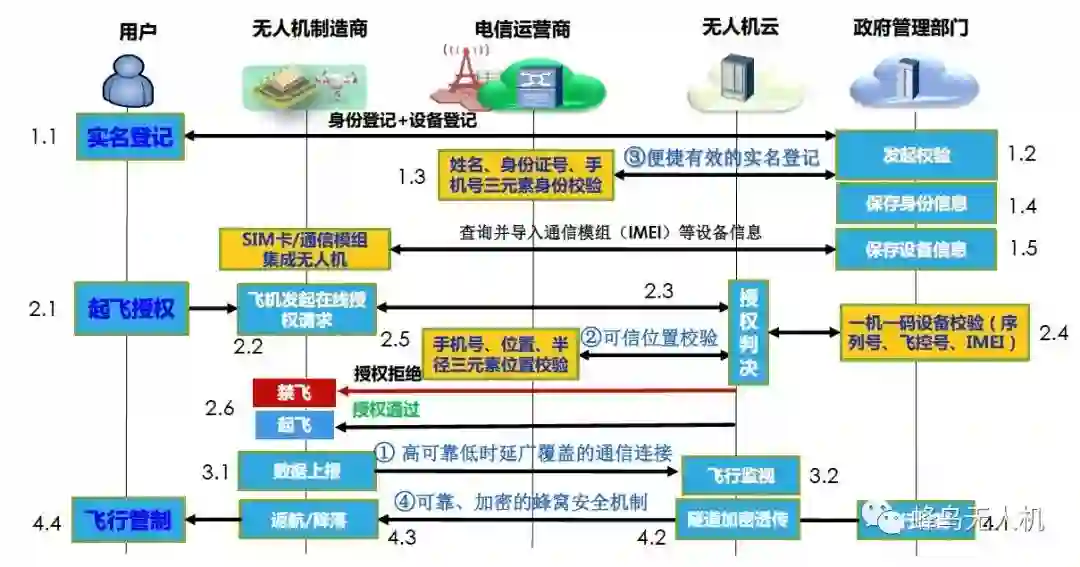 通过蜂窝联网,实现无人机便捷实名登记、可信位置校验、实时可靠数据传输,并通过一体化的完善的管理流程与加密认证技术实现整体业务安全等, 达到事前可预警、事中可管控、事后可追踪。