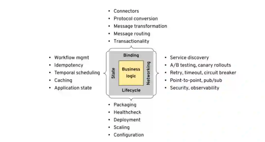 Runtime作为理论的出发点,Bilgin Ibryam提出现代分布式应用程序的需求分为4类,分别是生命周期(lifecycle)、网络(networking)、状态(state)和绑定(binding)。