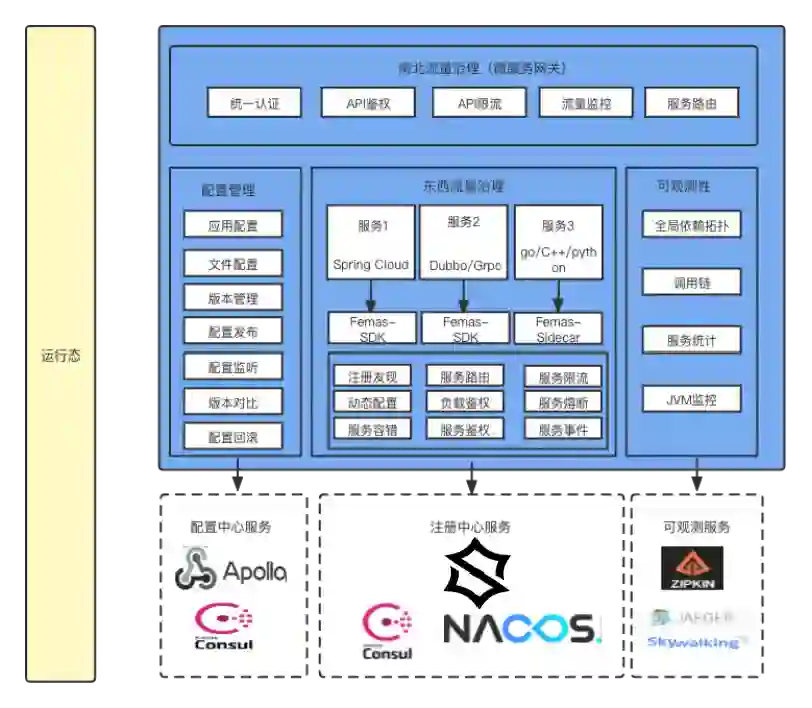 - 目前femas已经完成的运行时能力有:注册中心管理、服务治理、服务可观测、配置管理,其他运行时能力仍待完善。
