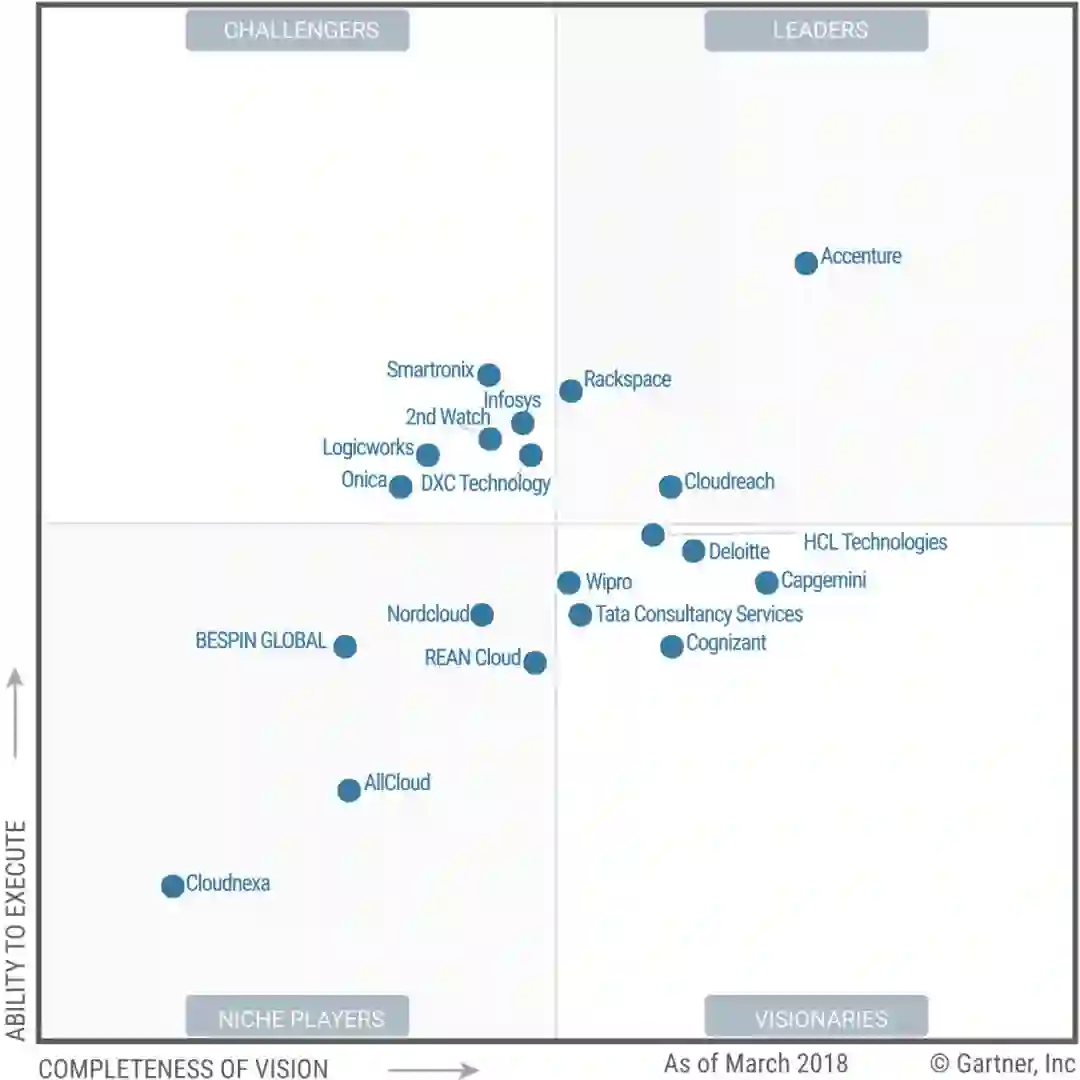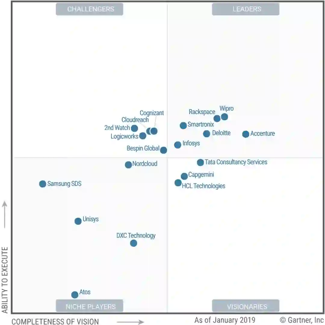 魔力象限列出了19家不同的MSP供应商,着重介绍它们的产品、优点和缺点。然后,Gartner按前瞻性和执行力来评估供应商。基于这些评估结果,供应商分为以下四类:领导者、挑战者、有远见者和特定领域者。Gartner今年分析的19家供应商是:2nd Watch、埃森哲、源讯(Atos)、贝斯平云科技(Bespin Global)、凯捷(Capgemini)、Cloudreach、高知特、德勤、DXC Technologies、HCL Technologies、印孚瑟斯、Logicworks、Nordcloud、Rackspace、三星SDS、Smartronix、塔塔咨询服务、优利(Unisys)和威普罗(Wipro)。