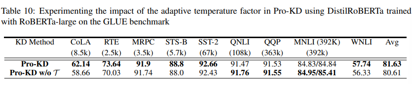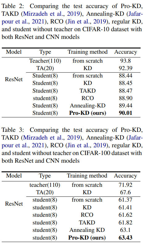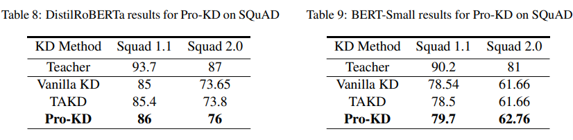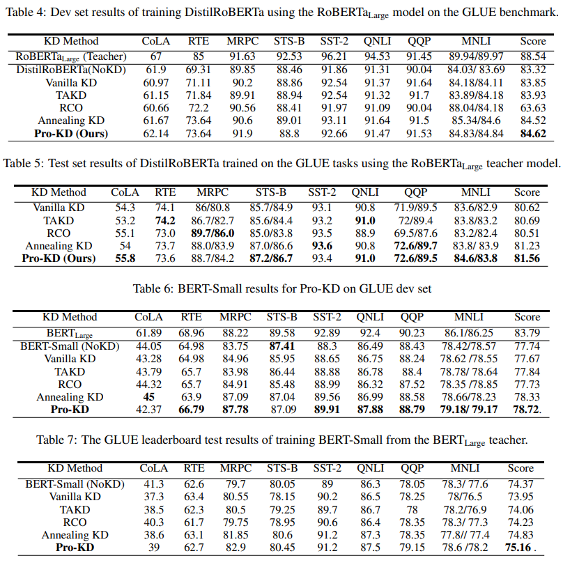 作者通过对 NLP(GLUE 基准和 SQuAD 1.1 和 2.0)和图像分类任务(CIFAR-10、CIFAR-100)的实验,表明了 Pro-KD 的有效性。