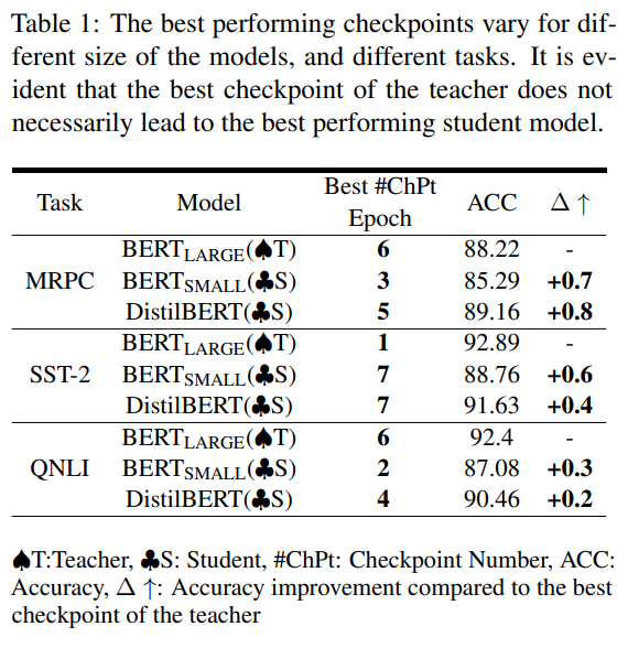 1. 检查点搜索问题:表现最好的教师模型 checkpoint 不一定是最适合蒸馏的教师,early-stopped checkpoint 没准反而是更好的教师模型。但搜索全部 checkpoint 非常耗时耗力,很难获取到最优的 checkpoint;下表展示了 BERT 系模型在不同数据集上的最优 checkpoint: