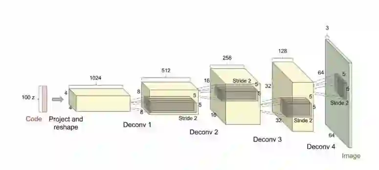 GAN 应用卷积神经网络最早的模型之一是 DCGAN,它代表了深度卷积生成对抗网络(Deep Convolutional Generative Adversarial Networks,DCGAN)。该网络从均匀分布中提取的 100 个随机数作为输入,并输出所需形状的图像。该网络由许多卷积、反卷积和完全连通的层组成。网络使用许多反卷积层将输入噪声映射到所需的输出图像。批量标准化用于稳定网络的训练。除了使用 tanh 层和 Leaky ReLU 的输出层外,所有层都使用 ReLU 激活。该网络使用小批量随机梯度下降法进行训练,并使用 Adam 优化器来加速训练,对超参数进行优化。这篇论文的结果很有趣。作者指出,这些生成器具有又去的向量运算性质,可以用我们想要的方式来处理图像。