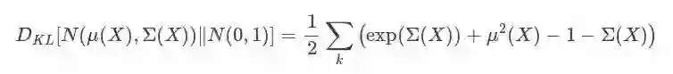 上面的方程有一个非常好的解释。术语 Q(z|X) 基本上是我们的编码器网络,z 是我们对数据 x(x∈X) 的编码表示,P(X|z) 是我们的解码器网络。因此,在上面的方程中,我们的目标是在 D_KL[Q(z|X)||P(z|X)],在某些误差下,极大似然估计数据分布。由于 P(z|X) 不易处理,但 KL 散度项≥0,因此很容易看出 VAE 试图最小化 log(P(X)) 的下界。这和最大化 E[logP(X|z)] 和最小化 D_KL[Q(z|X)||P(z|X)] 是一样的。我们知道最大化 E[logP(X|z)] 是一个极大似然估计,并使用解码器网络进行建模。正如我前面说过的,我们希望我们的潜在表示接近于高斯函数,因此我们假设 P(z) 为 N(0,1)。按照这个假设,Q(z|X) 也应该接近这个分布。如果我们假设它是具有参数μ(X) 和Ʃ(X) 的高斯分布,则由 KL 散度给出的这两个分布(即 P(z) 和 Q(z|X))之间的差异导致的误差的封闭形式的解,解决方案如下: