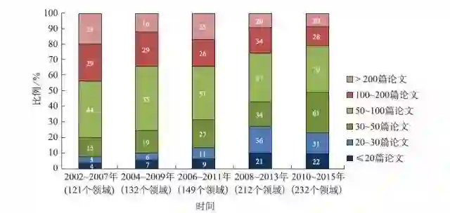图1 显示了五期研究领域的核心论文数量分布,Y 轴显示了研究领域占比,图柱中的数字为某一论文量范围内的研究领域的个数。可以看出,大部分研究领域的核心论文量在30~100 篇,占总数的50% 以上。大于200 篇论文的研究领域数量和100~200 篇论文的研究领域数量五期中基本持平,占比逐步减小;50~100 篇论文的研究领域数量有所增长,但占比呈下降趋势。30~50 篇、20~30 篇、小于或等于20篇论文的研究领域内无论是数量还是占比都呈现增长的趋势。总体来说,五期中论文量大于50 篇的研究领域数量基本持平,占比呈下降趋势,小于50 篇的研究领域数量和占比呈增长趋势。新兴研究领域的平均论文量为40.5 篇,其规模较小,数量越来越多。持续发展的研究领域的平均论文量为107.9 篇。