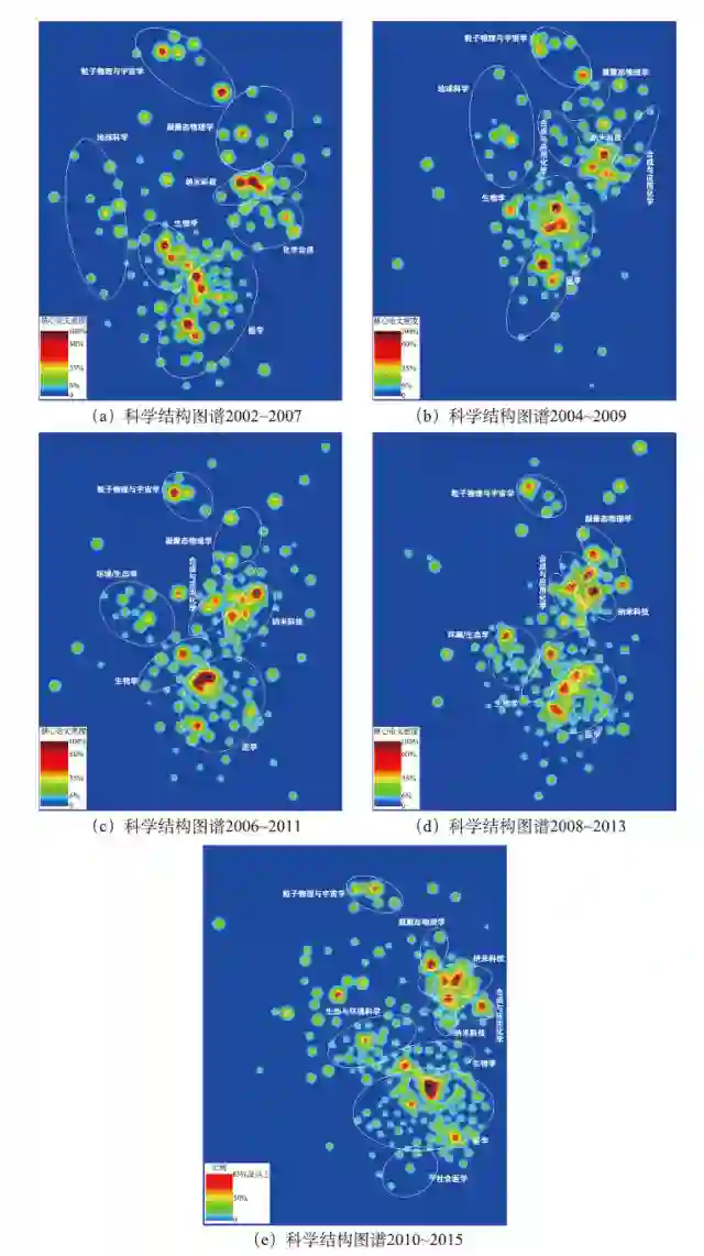本文通过每隔两年绘制的科学结构图谱分析科学结构的发展情况。图3-3 采用密度图的方式展现2002 ~2007 年、2004 ~2009 年、2006 ~2011 年、2008 ~2013 年、2010~2015 年五个时期科学结构的时序变化。