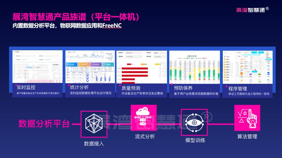 展湾智慧通®就是一个工业互联网与AI完美结合,采用了典型的三层架构——把采集到的数据汇聚送给平台;在平台进行数据清洗处理后,存储在时序数据库、内存数据库和关系数据库中;在对数据进行分析计算来实现实时看板和统计分析;最后根据历史数据进行模型和算法训练,再把算法下发进行边缘计算,确保实时性和可靠性。