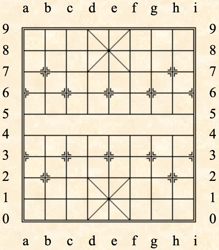简单来说,ICCS 记谱就是将棋盘用如下图的横纵坐标表示,每一步走法只需要记录起始坐标,比如“h2e2”就是指将原来位于坐标(h, 2)的子移动到(e, 2),如果是当前局面是新开局,那么这就对应着走法“炮二平五”。这样一来每一步就只需要 4 个字符来记录了,n 步的棋谱就变成了 4n 长度的字符串了。