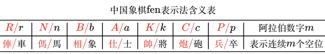 ”。其中红色部分表示局面,小写表示黑方,大写表示红方,不同行之间用/隔开,字母含义如下表。