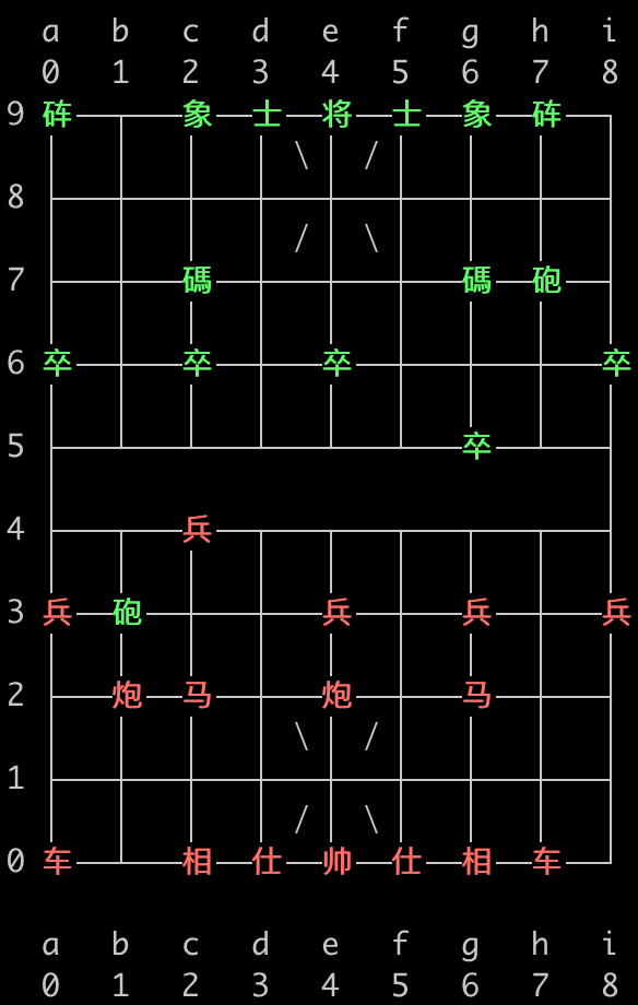 这样,“rnbakabnr”就表示第一行为黑子的“車馬象士將士象馬車”,“9”表示第二行 9 个点都是空白的,“1c5c1”表示第三行是“1个空白 +1 个黑砲 +5 个空白 +1 个黑砲 +1个空白”,等等;绿色部分表示轮到哪一方走子,“w”表示红方,“b”表示黑方;剩下部分一般不大重要,有兴趣的读者自己去看链接就行。