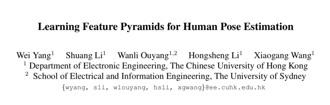 Learning Feature Pyramids for Human Pose Estimation 是发表在 ICCV 2017 的工作,论文提出了一个新的特征金字塔模块,在卷积网络中学习特征金字塔,并修正了现有的网络参数初始化方法,在人体姿态估计和图像分类中都取得了很好的效果。