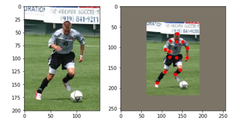 这里采用的是先扩展边缘,然后放大图片,再进行 crop,这样做能够保证图片中心处理后依然在中心位置,且没有关节因为 crop 而丢失。注意在处理图片的同时需要对标注也进行处理。