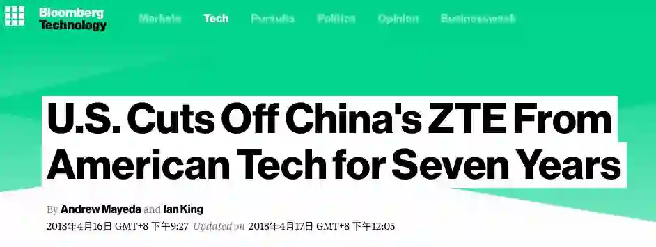 在 2018 年 4 月 16 日,美国商务部部长 Wilbur Ross 突然宣布,因违反了美国限制向伊朗出售美国技术的制裁条款,将禁止美国公司向中兴通讯销售零部件、商品、软件和技术,期限为 7 年。