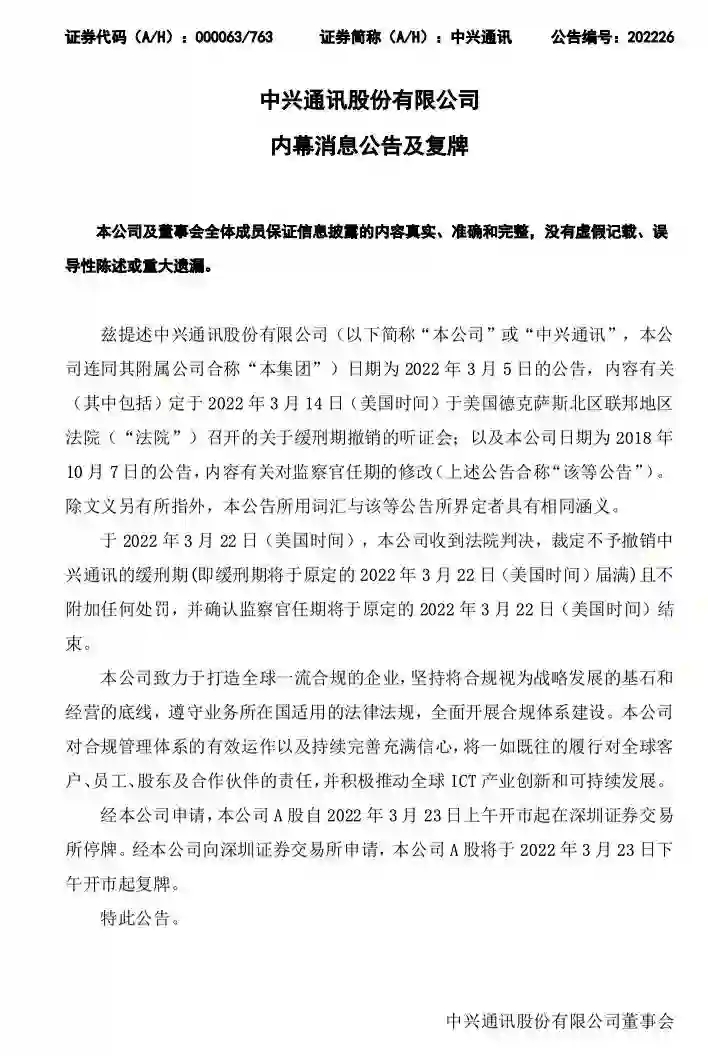 经过了几年的辗转,美国一名法官于 2022 年 3 月 23 日裁定,中兴通讯应被允许结束五年合规观察期。随着观察期的结束,中兴通讯于当日下午开市起复牌之后,股价大涨,股民以及诸多行业者一直被压抑的情绪也在此刻释放。
