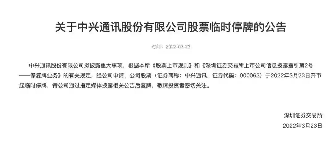 2022 年 3 月 23 日,深证证券交易所发布了一则《关于中兴通讯股份有限公司股票临时停牌的公告》,公告显示,中兴拟披露重大事项,该公司于 3 月 23 日开市起临时停牌。