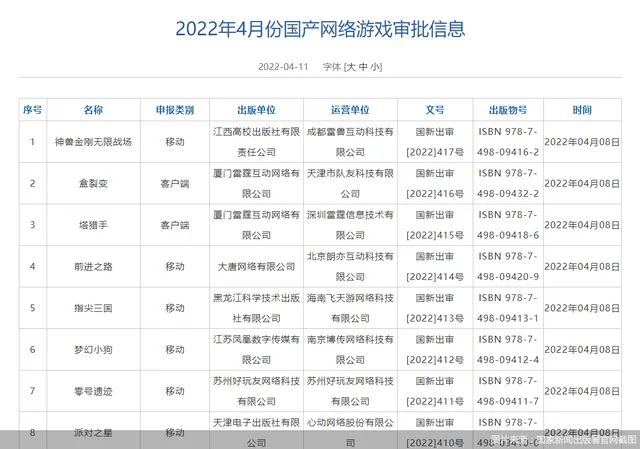 据报道,国家新闻出版署发放4月游戏版号,共45款国产游戏获得版号,包括三七互娱的《梦想大航海》、中青宝的《铸时匠》等。这也是时隔8个月,国产游戏版号重新获批。共有45款游戏拿到版号,其中移动游戏39款,客户端游戏5款、Switch游戏1款。