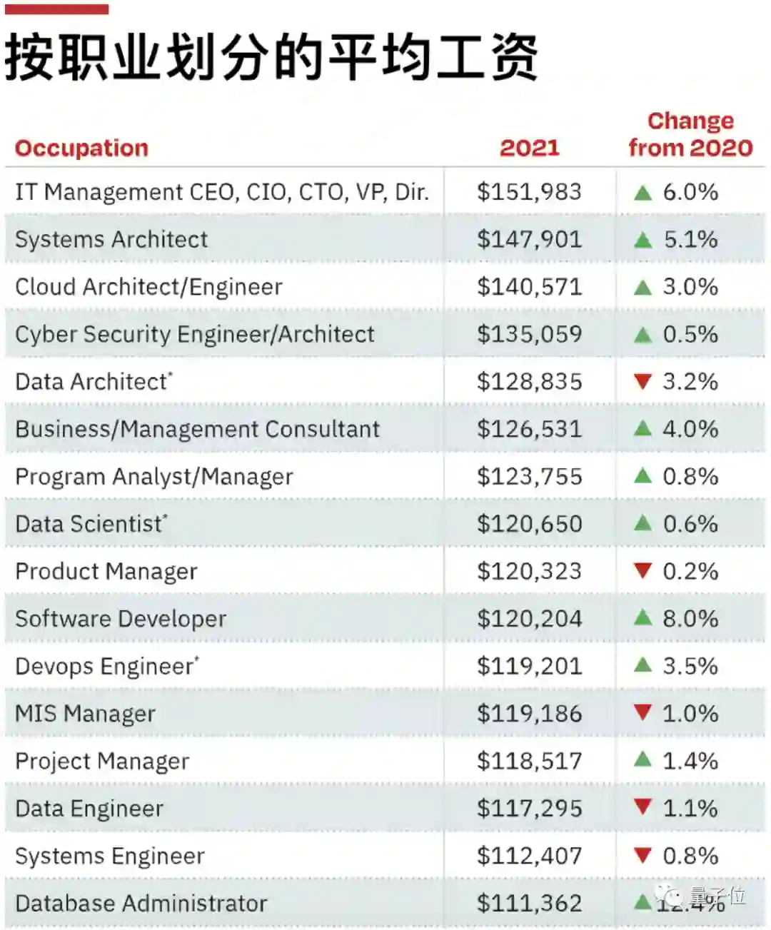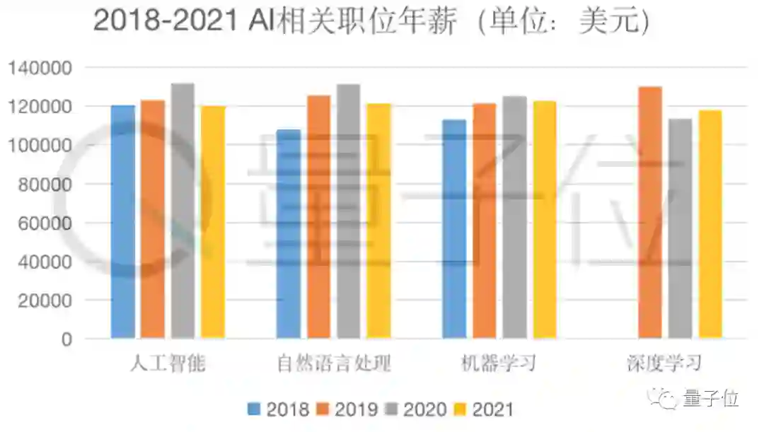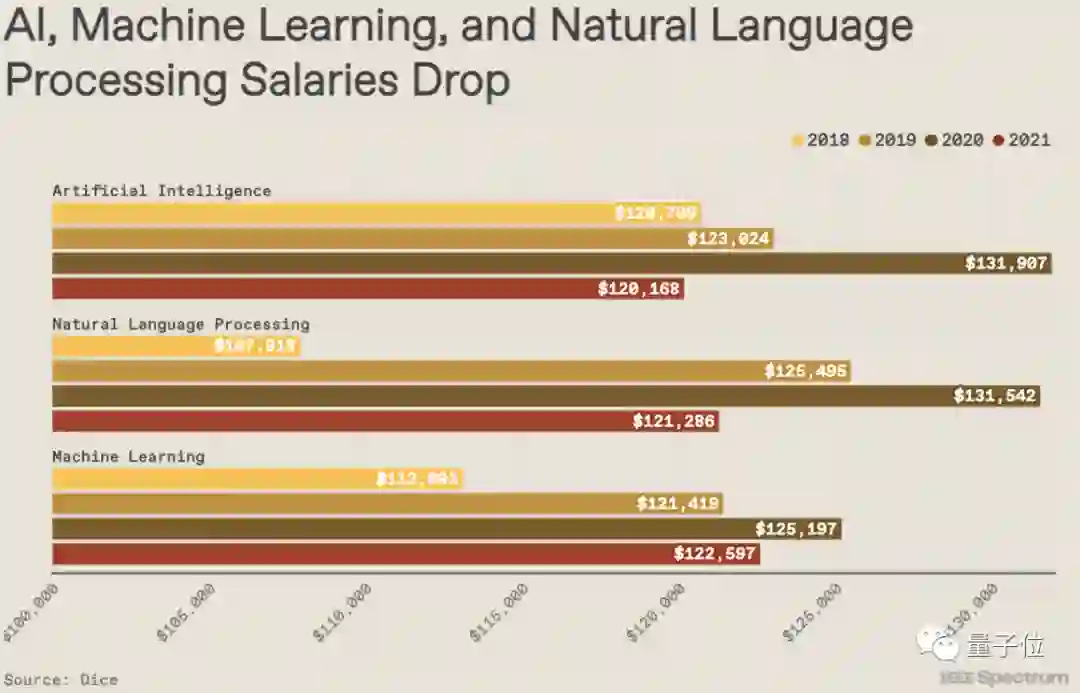2021年人工智能年薪比2020年降低了8.9%,甚至比2018年的120709美元还低(2021年整体是120168美元)。