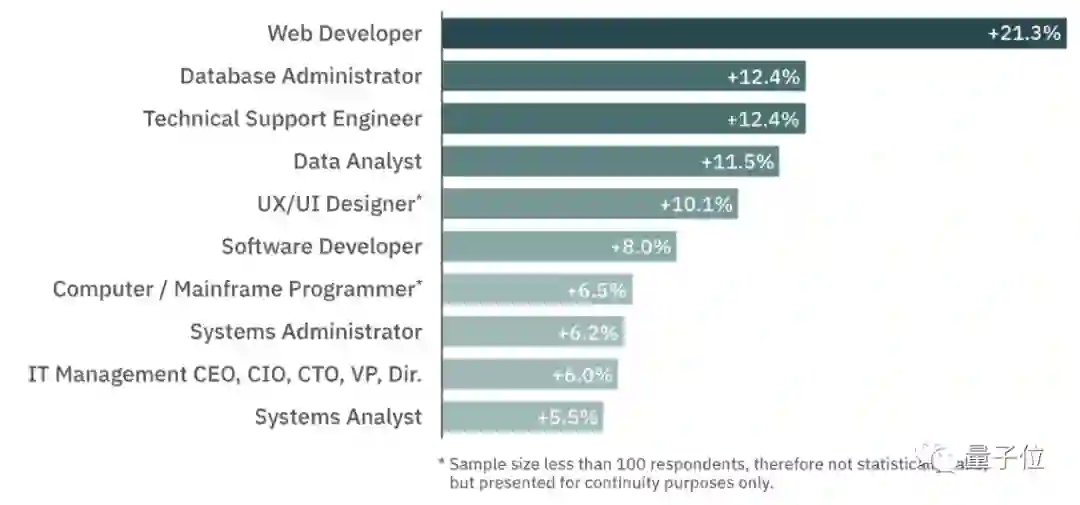 其中,增长最快的岗位是Web开发工程师,以21.3%的增幅甩了后面几名一大截。此外,DBA(数据库管理员)、数据分析师和技术支持的潜力也不可小觑。