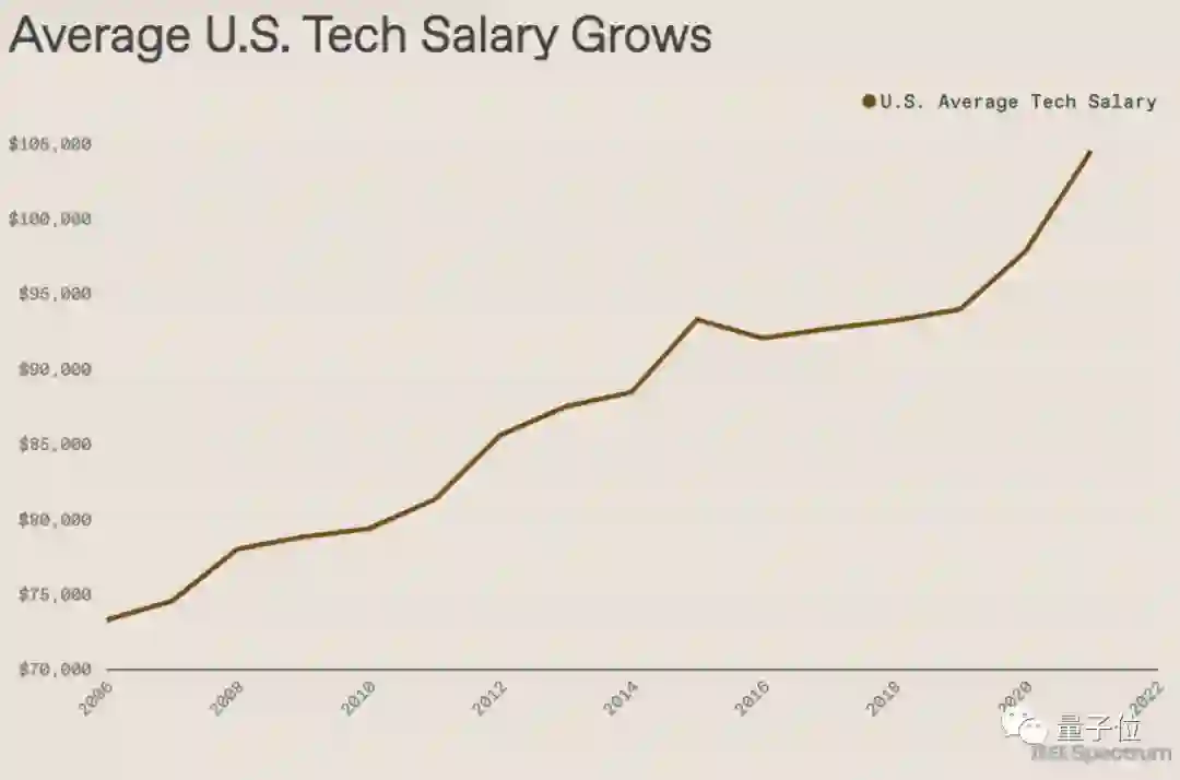 据IEEE Spectrum报道,2021年全美技术人员的平均年薪上涨了6.9%,从五位数(97859美元,约62万人民币)突破到了六位数:104566美元(约66万人民币)。