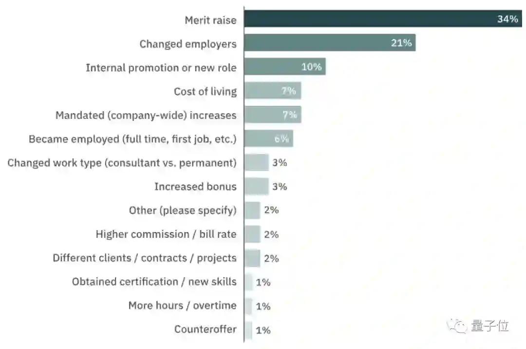然而,大家涨薪的原因并非来源于跳槽,而是调薪(Merit raise),占比高达34%,至于跳槽和内部晋升分则分别占第二、三名。