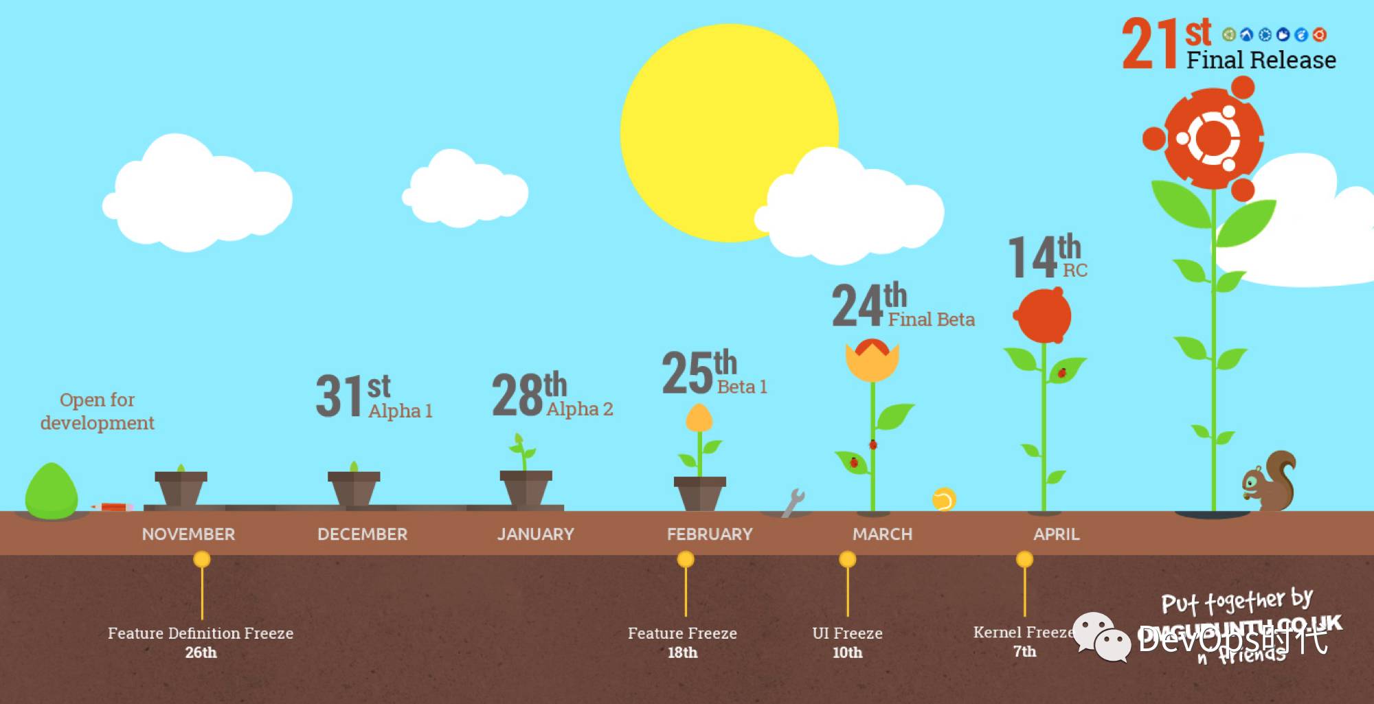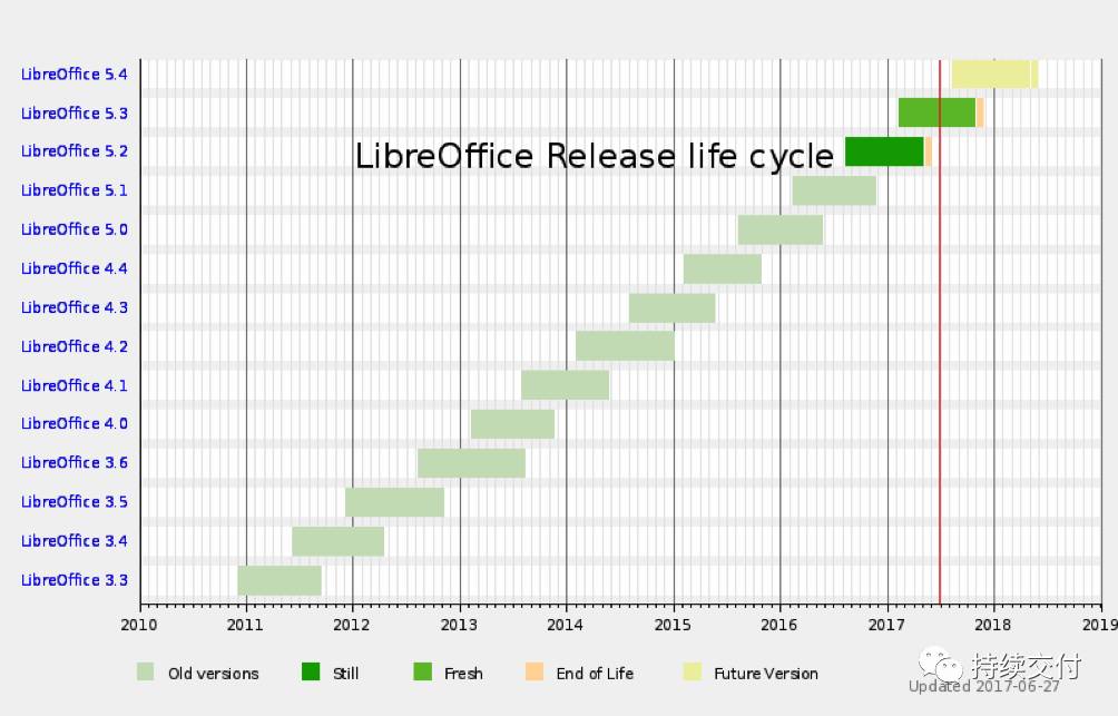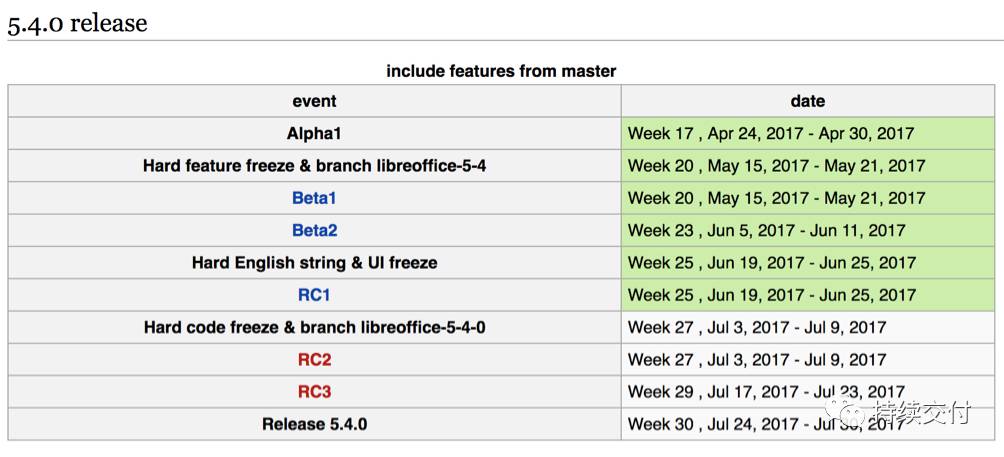 2. 整个生命周期中各个阶段及预定日期,如下图(LibreOffice5.4版本火车的时间表 )所示