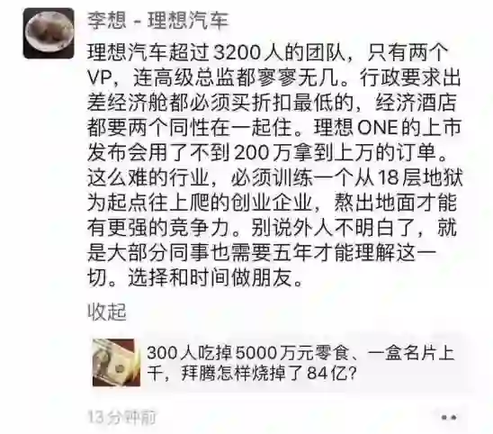 【李想评拜腾失败:熬出地面才能有更强的竞争力】7月5日晚间,理想汽车CEO李想在朋友圈转发一篇名为《300人吃掉5000万零食、一盒名片上千,拜腾怎样烧掉了84亿?》的文章,李想表示,这么难的行业,必须训练一个从18层地狱为起点往上爬的创业企业,熬出地面才能有更强的竞争力。“别说外人不明白了,就是大部分同事也需要五年才能理解这一切。”“行政要求(员工)出差经济舱都必须买折扣最低的,经济酒店都要两个同性在一起住。理想ONE的上市发布会用了不到200万拿到上万的订单。”在李想看来,理想汽车在支出上非常节省,堪称“地狱模式”。据了解,拜腾的CEO戴雷6月29日给全体员工发送邮件,宣布拜腾中国区将停工停产6个月,1000多名员工中,仅保留小部分留守,维持公司最基本的职能运转。
